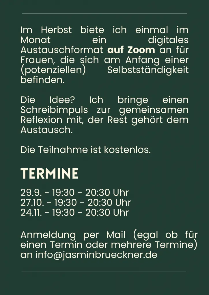 Du bist weiblich und stehst am Anfang deiner (potenziellen) Selbstständigkeit? Du hast Lust auf Austausch in entspannter Runde? Dann schau mal: